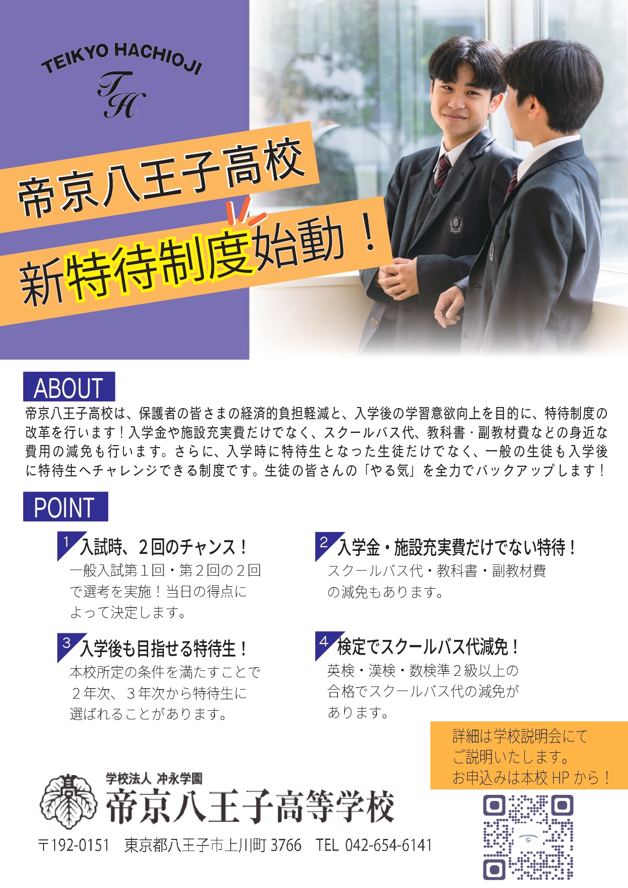 帝京八王子高等学校では、下記の日程で体験入試・学校説明会・個別相談会をおこないます。