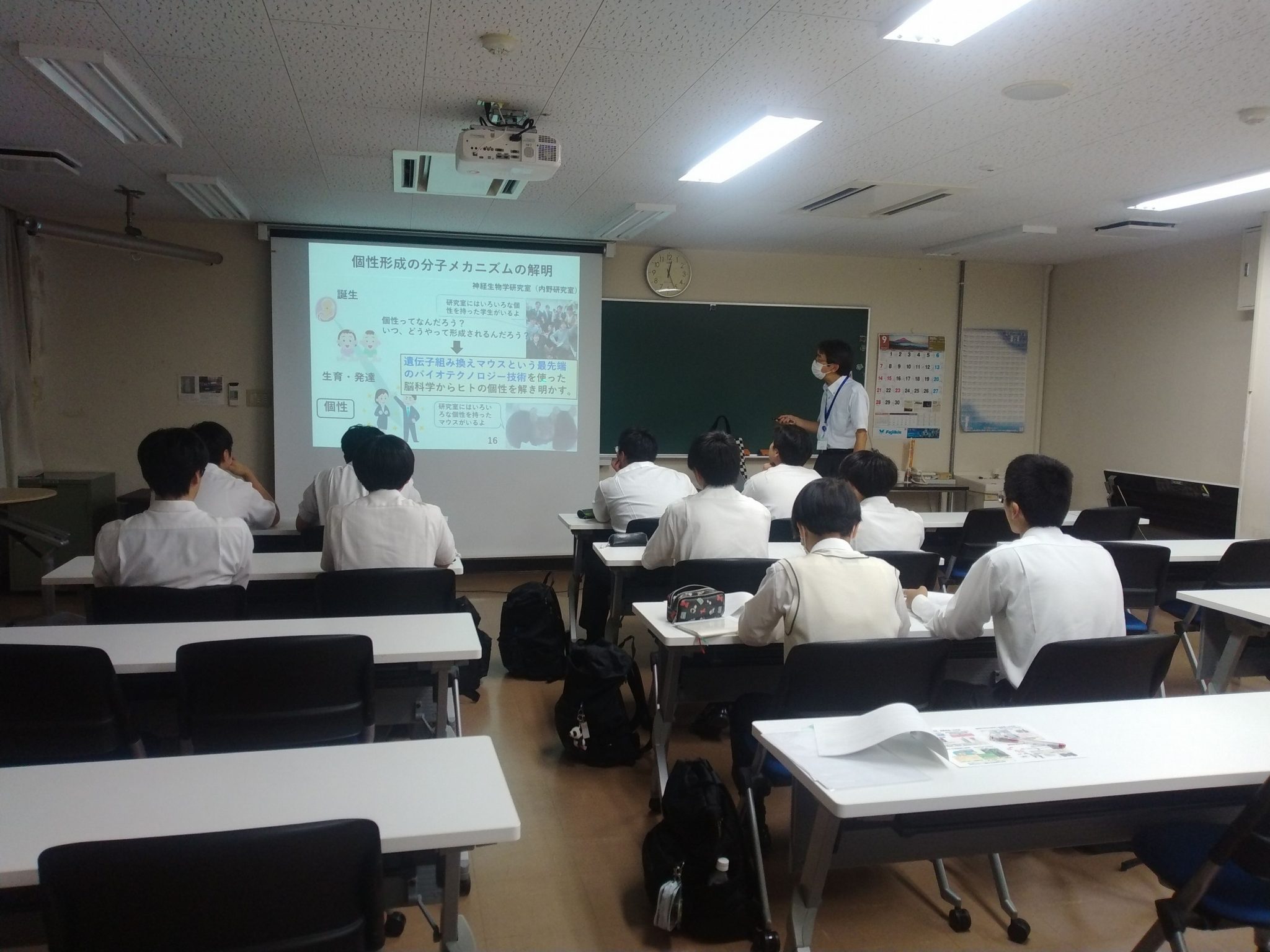 今年度より理工学部は総合理工学科4コースへと再編されました。生物選択者は、そのうちの環境バイオテクノロジーコースの先生方の話を伺いました。遺伝子改変マウスの個性を観察し、ゆくゆくは人の個性の生まれ方を、脳のメカニズムから解明しようとする研究や、イネやトマトなどの植物を遺伝子レベルで研究している様子を見学しました。