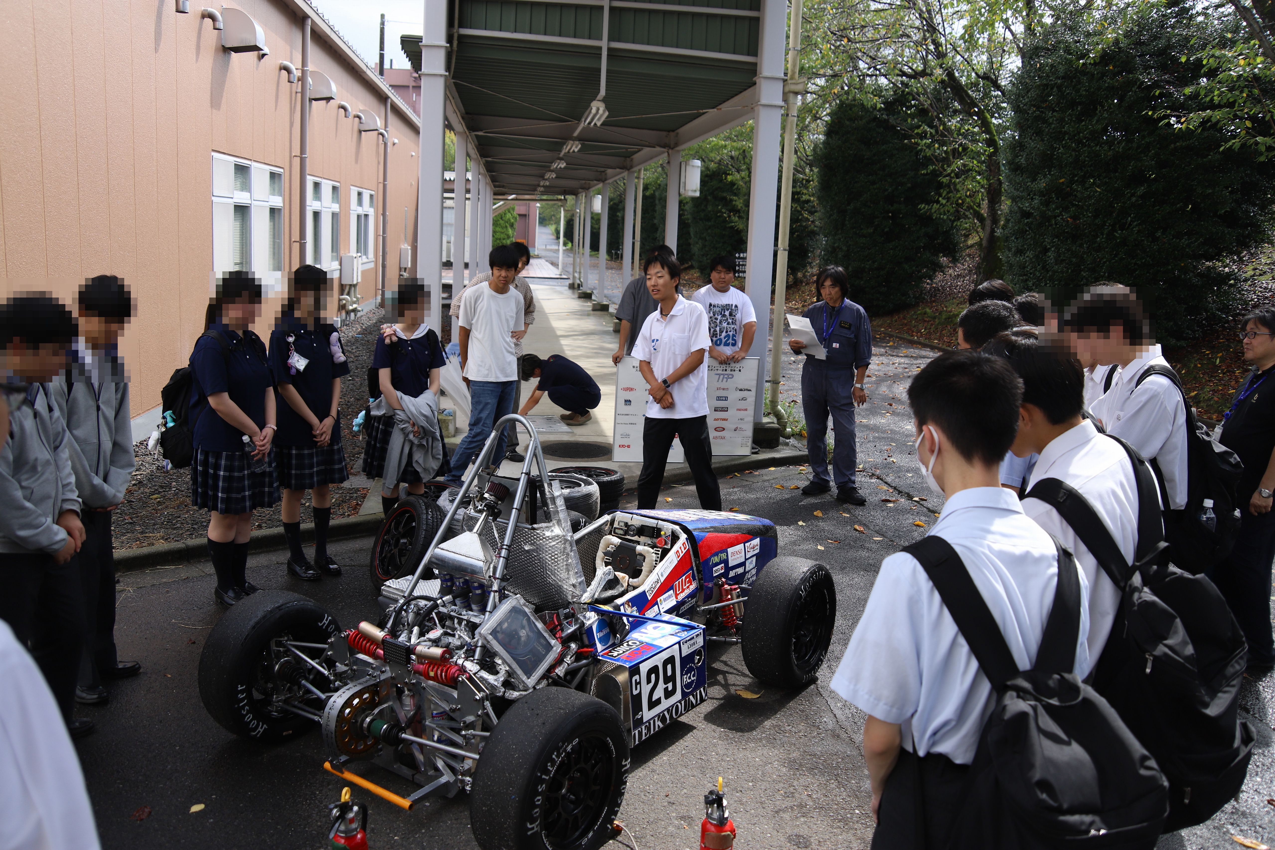 また物理選択者は、鳥人間コンテストへの出場を目指しているSky Projectや、全日本学生フォーミュラ大会に出場しているフォーミュラプロジェクトの様子を見学しました。機械・航空宇宙コースの先生からは、独自の人工衛星打ち上げについての話を、ロボティクス・AIコースの先生からは、ロボコン世界大会に出場するロボットについての話を伺いました。