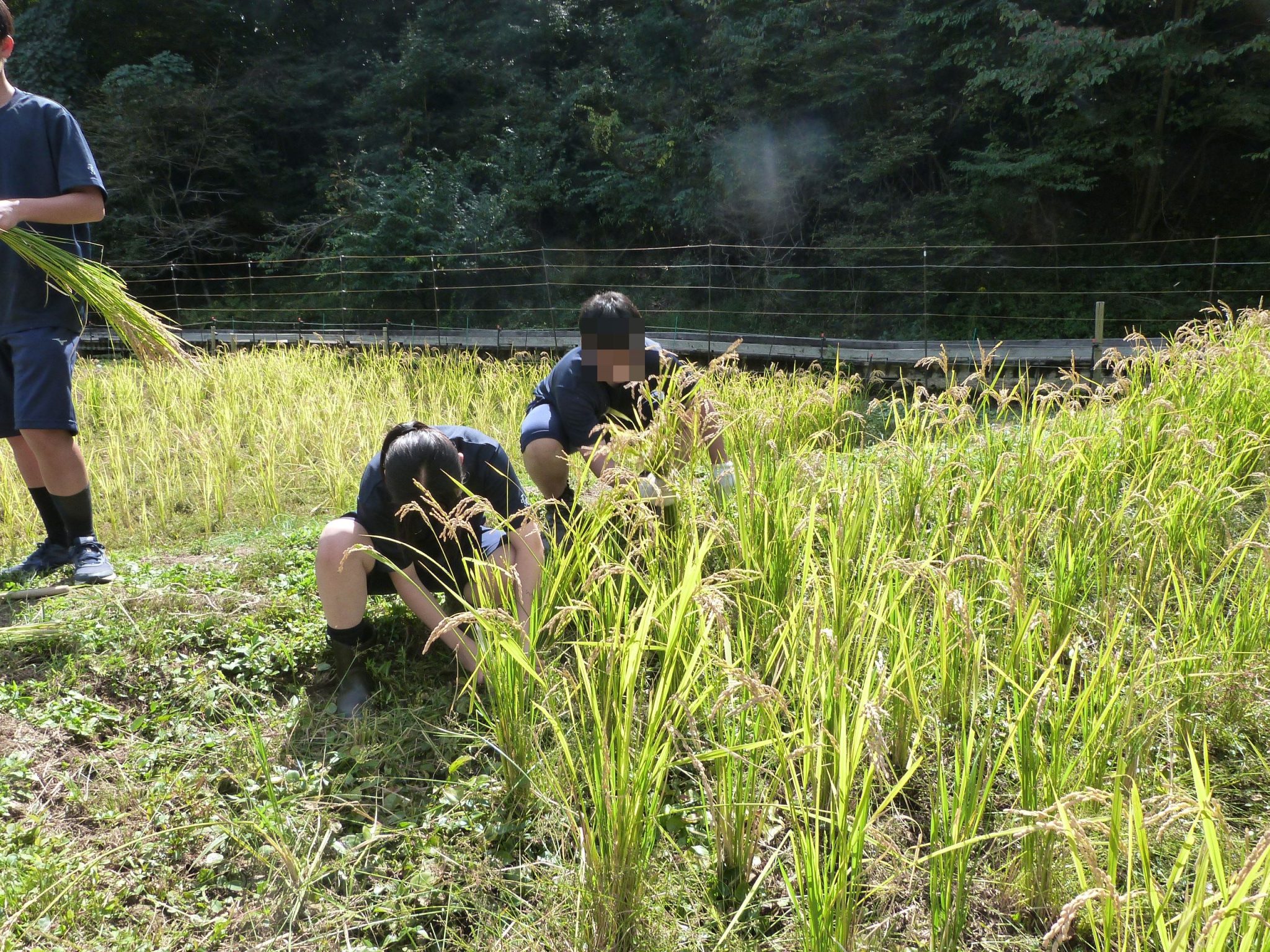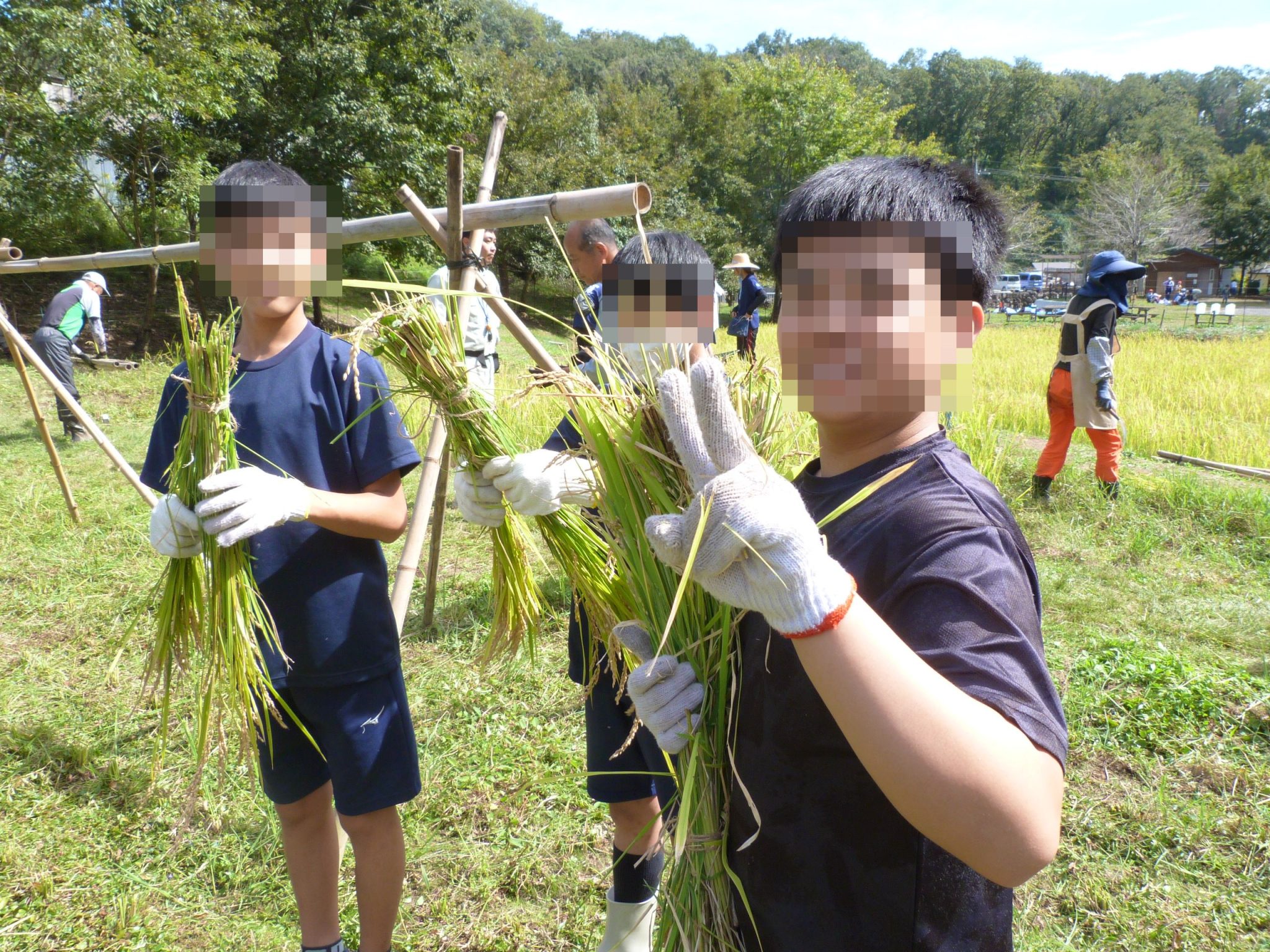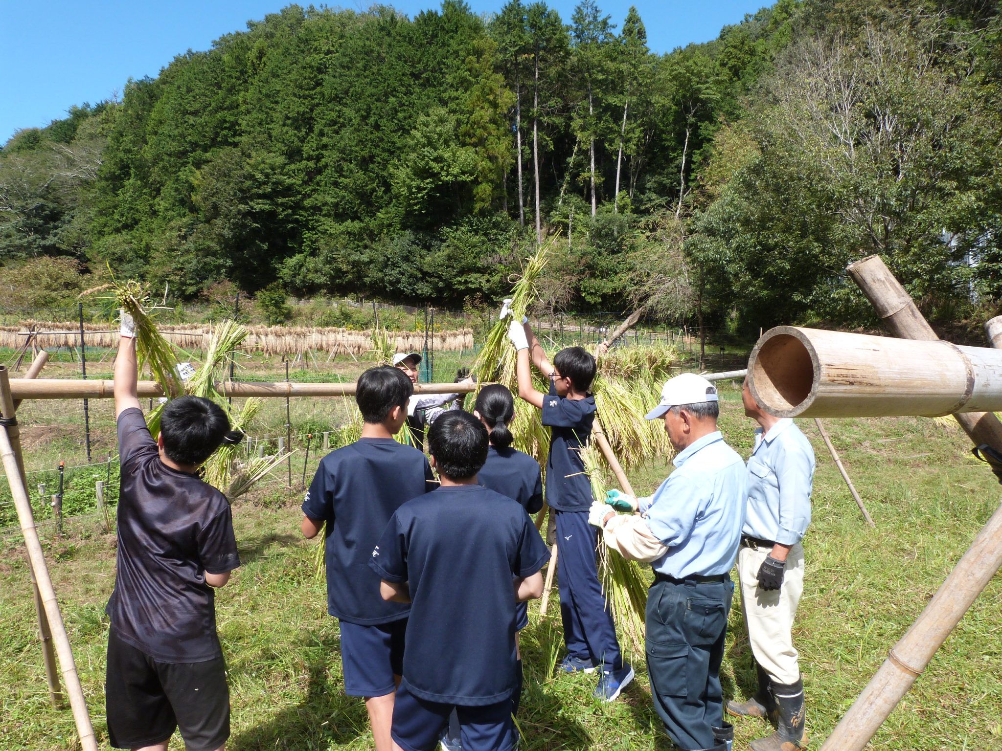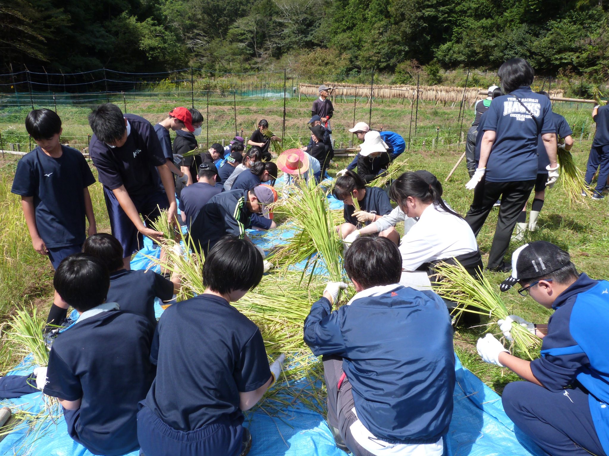 10月8日、上川口小学校の稲作体験にボランティアとして、本校中学1年・2年の生徒が参加しました。6月に田植え、7月に草取りをし、本日は稲刈りです。「上川の里」にある水田では、青空と山の緑のコントラストのもと、稲穂が黄金色に実っていました。地元のNPOの方々の指導があり、上川口小の生徒が刈った稲穂を、本校の生徒が束にして麻ヒモで結わえてまとめ、天日干しにしていきました。その後、本校生徒も実際に鎌をもって稲を刈りました。刈るよりも結わえてまとめる方が大変であることが良くわかりました。慣れない手つきながらも、生徒たちはがんばってまとめ、落穂もしっかり拾っていました。