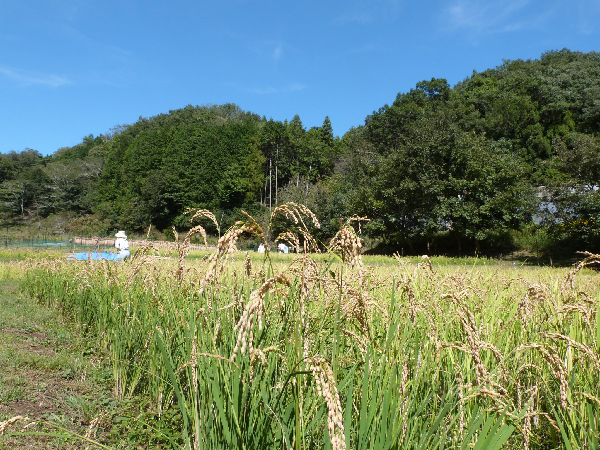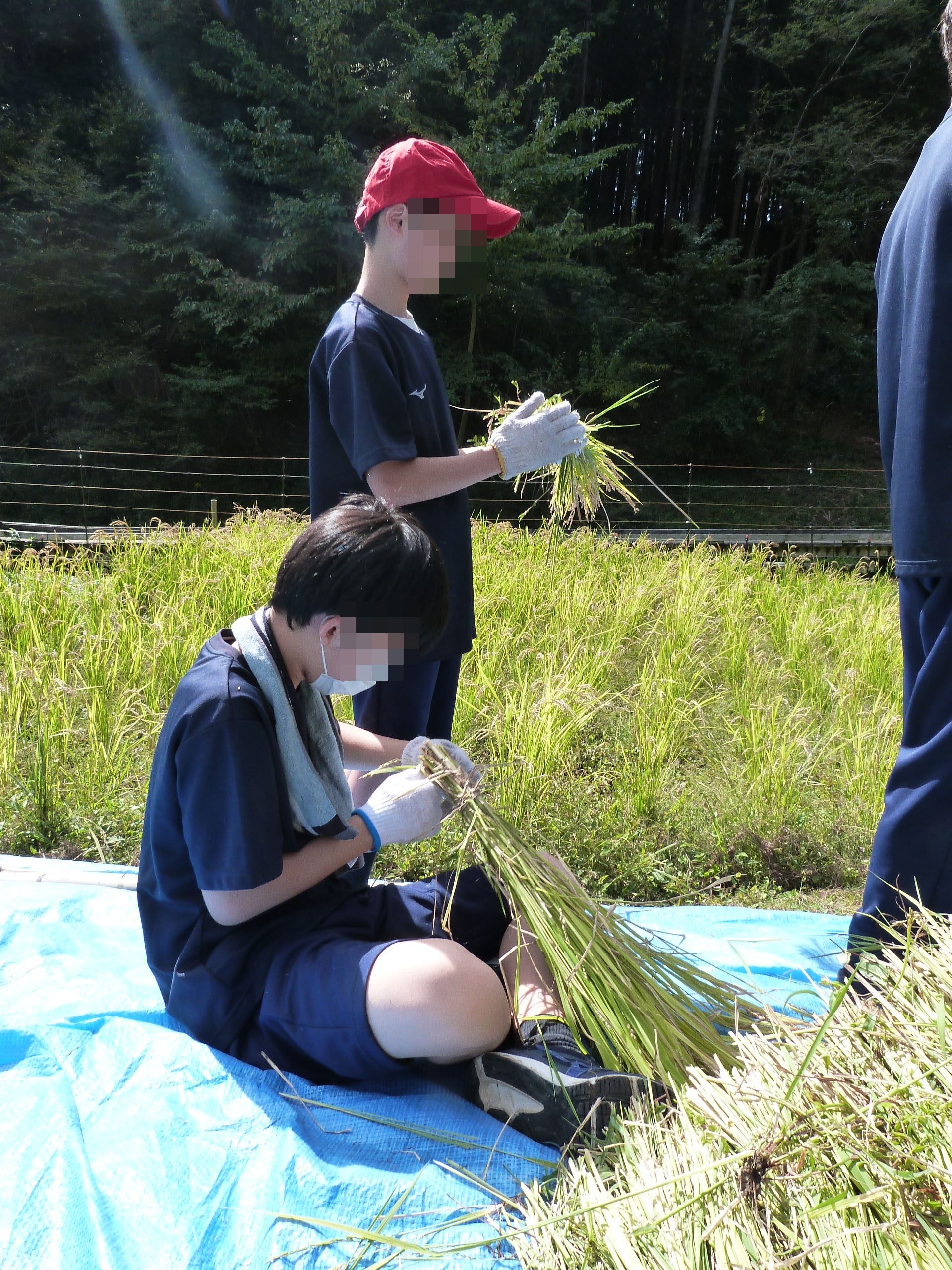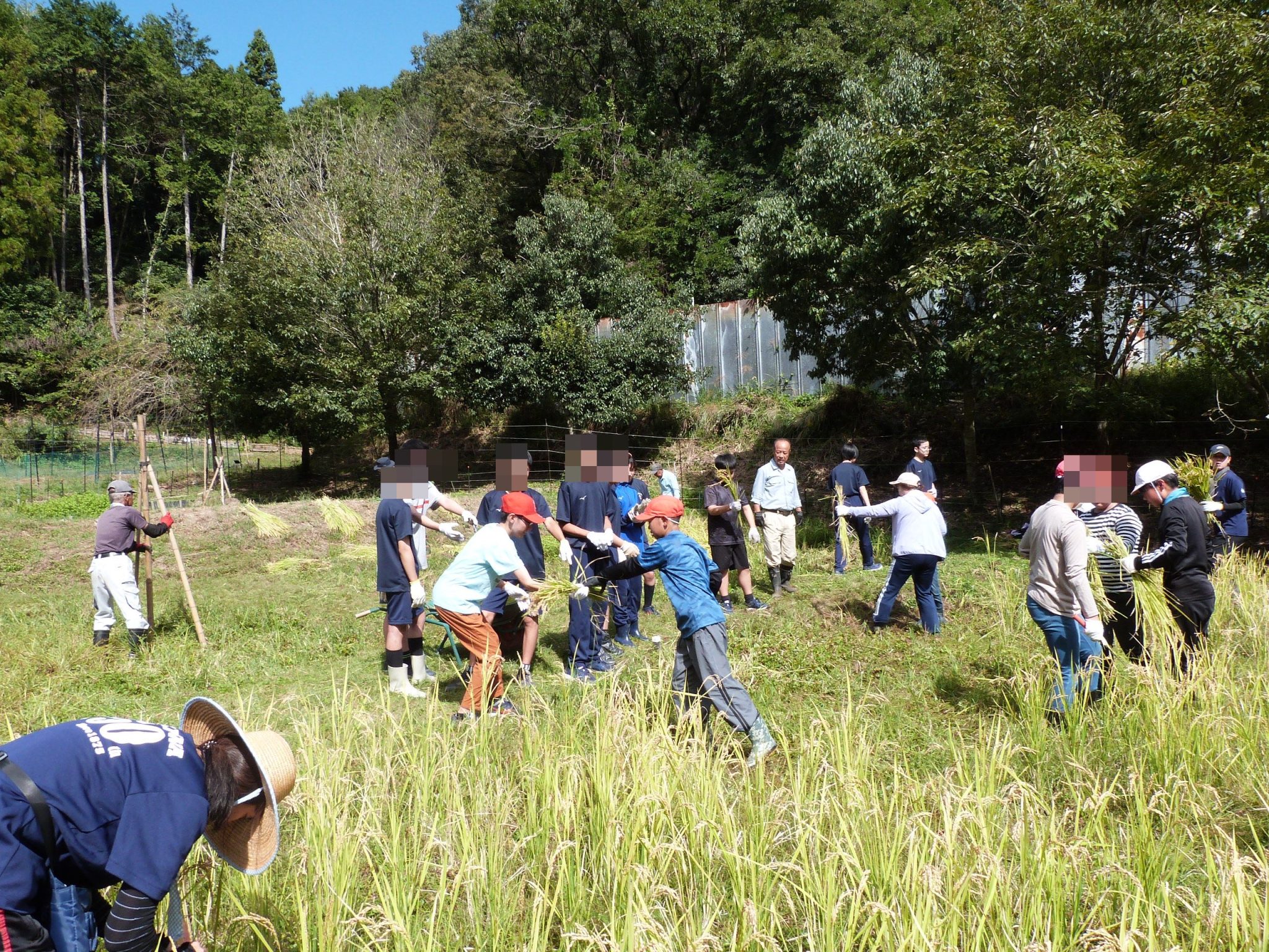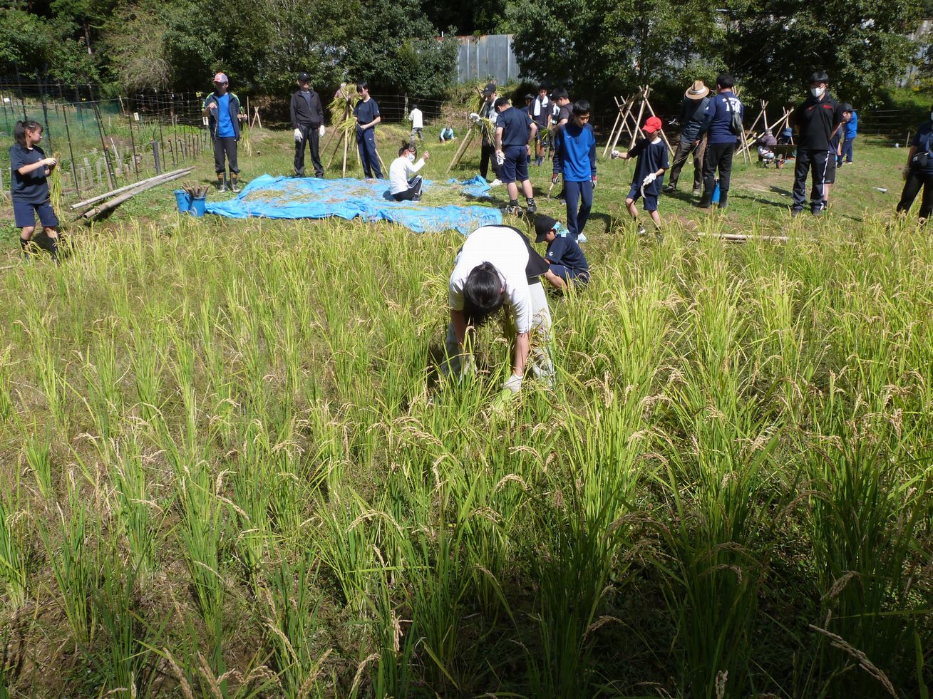 10月8日、上川口小学校の稲作体験にボランティアとして、本校中学1年・2年の生徒が参加しました。6月に田植え、7月に草取りをし、本日は稲刈りです。「上川の里」にある水田では、青空と山の緑のコントラストのもと、稲穂が黄金色に実っていました。地元のNPOの方々の指導があり、上川口小の生徒が刈った稲穂を、本校の生徒が束にして麻ヒモで結わえてまとめ、天日干しにしていきました。その後、本校生徒も実際に鎌をもって稲を刈りました。刈るよりも結わえてまとめる方が大変であることが良くわかりました。慣れない手つきながらも、生徒たちはがんばってまとめ、落穂もしっかり拾っていました。