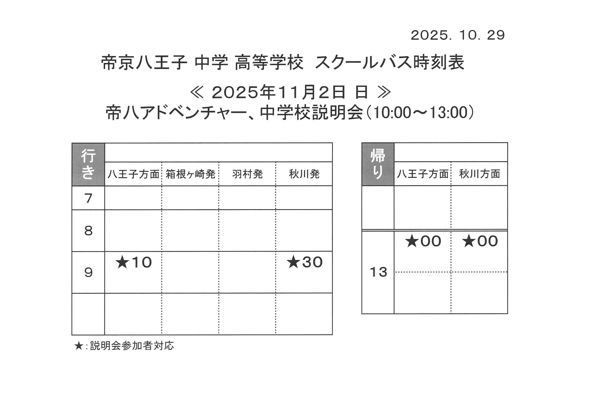 11月2日(日)中学説明会・帝八アドベンチャー用スクールバス時刻は以下の通りです。