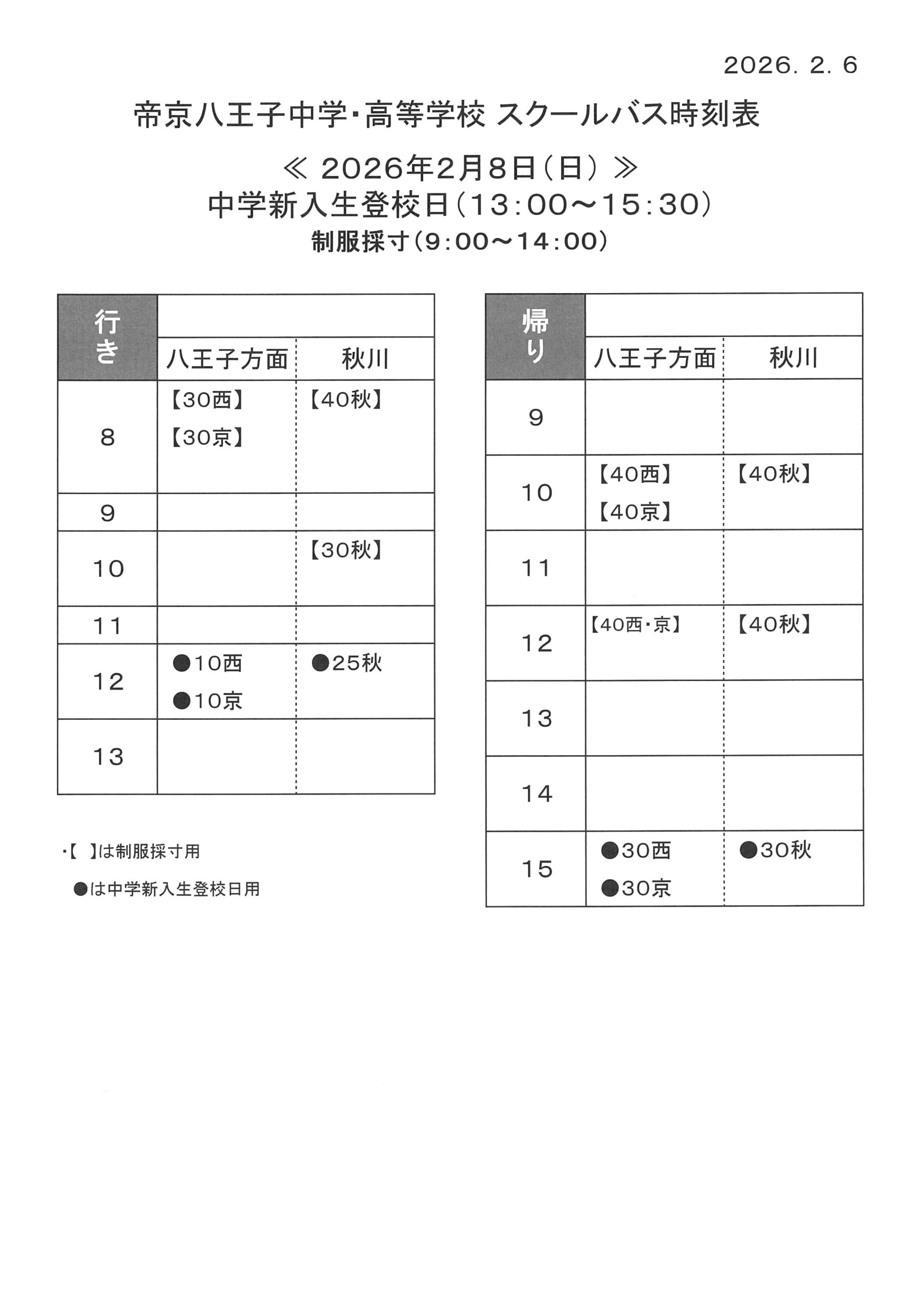 2月8日(日)中学新入生登校日・制服採寸用スクールバス時刻は以下の通りです。
