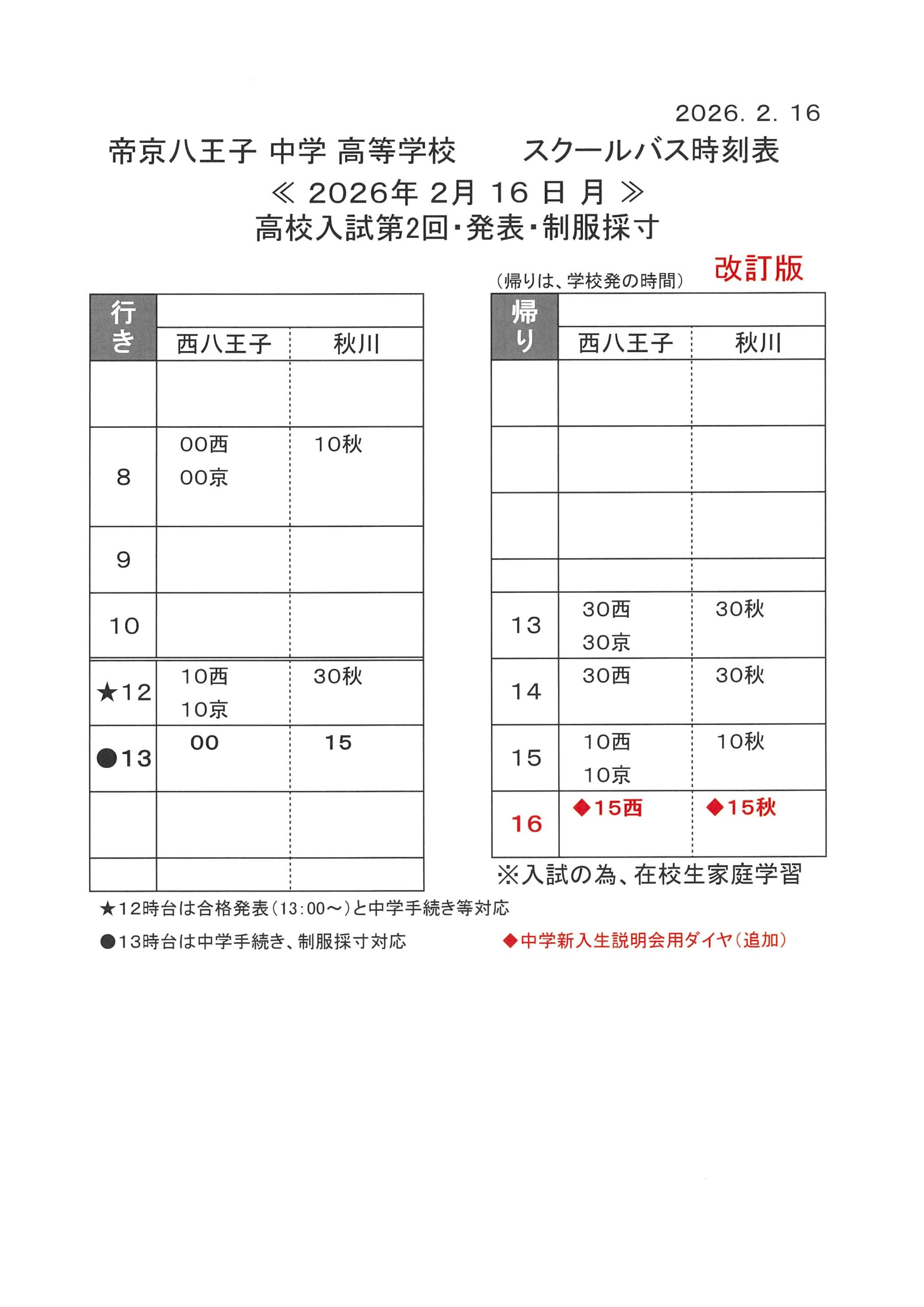 【改訂】2月16日(月) 高校一般入試 第2回 バスダイヤ