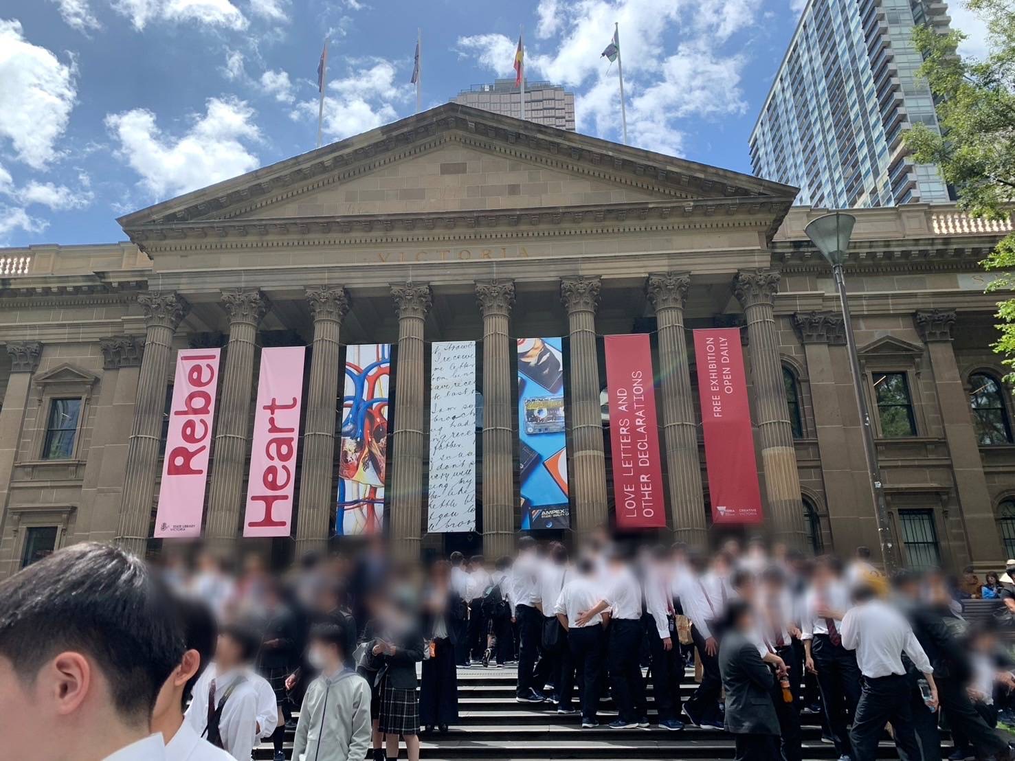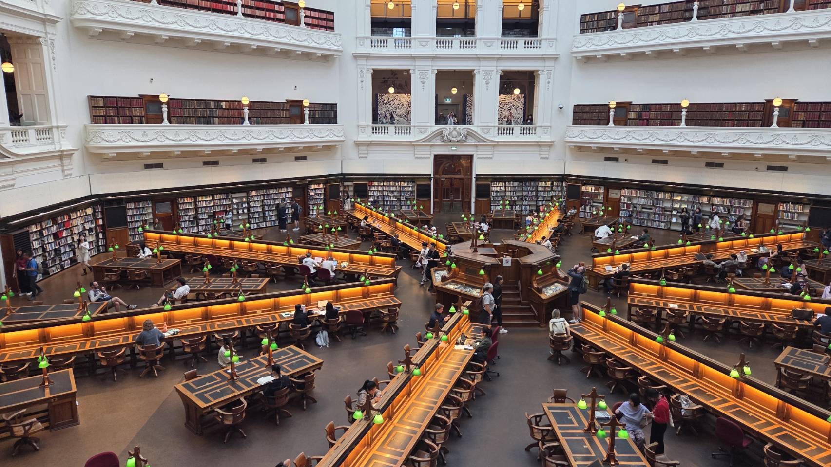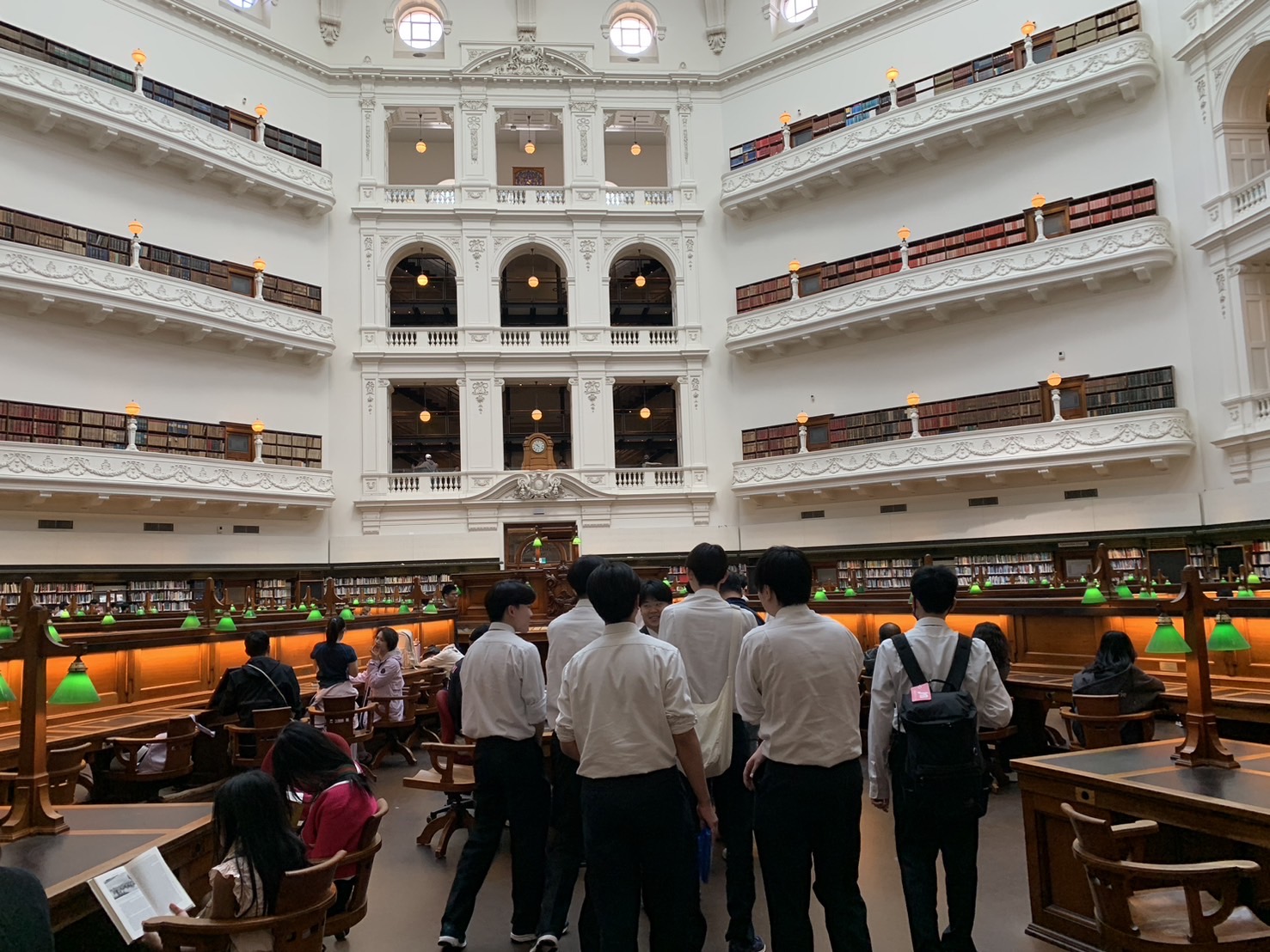 現地1日目の午前中は、オーストラリア最大級の規模を誇るビクトリア州立図書館を訪問しました 。天井のガラスドームから光が差し込む「ラ・トローブ読書室(リーディングルーム)」では、その建築美に圧倒されていました。その後はフードコートへ移動し、班ごとに自由昼食や買い物を楽しみました。