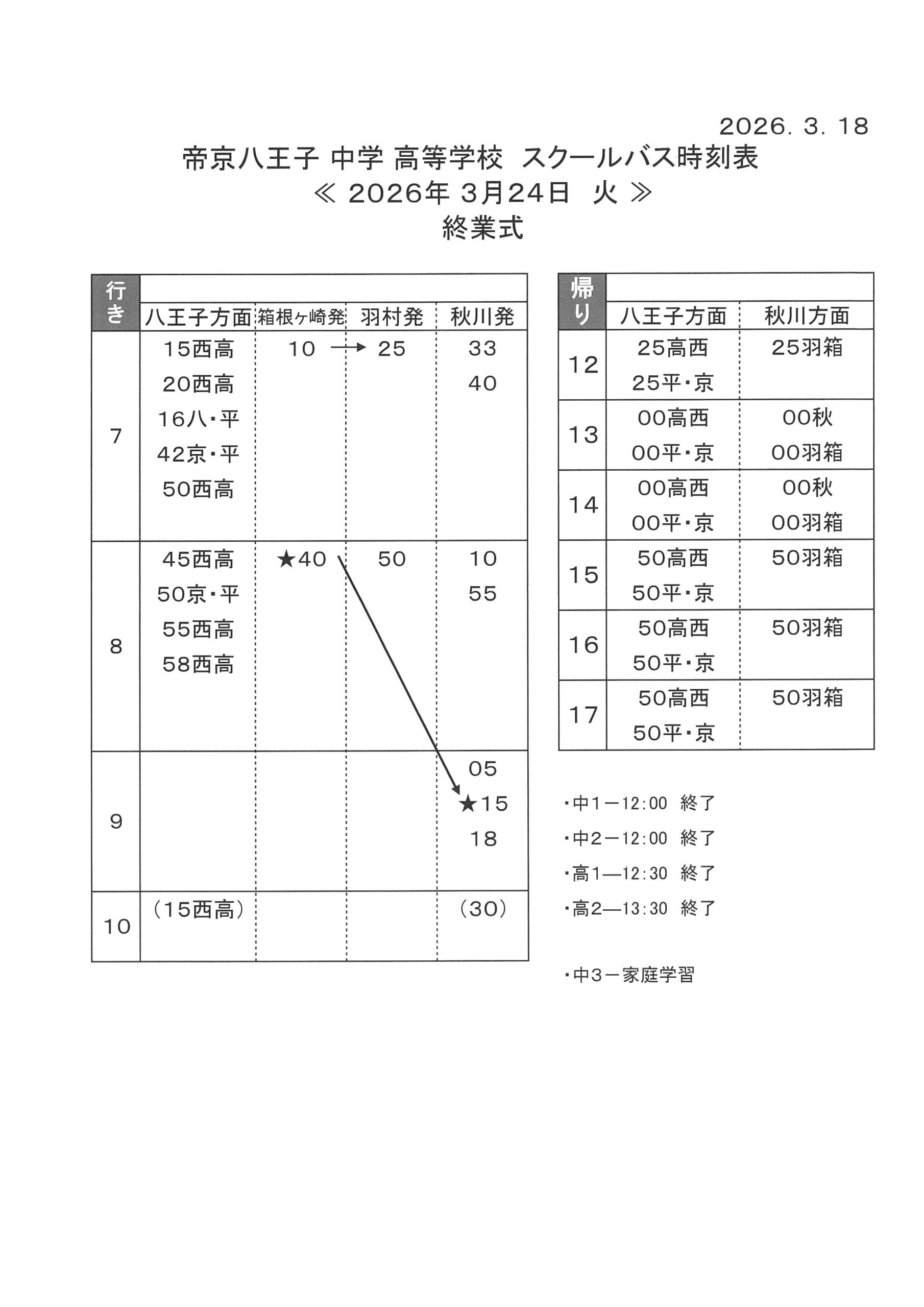 3月24日(火) 終業式 特別ダイヤ